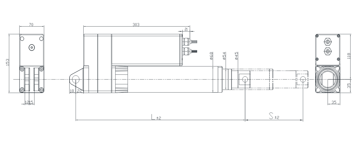 Operating Voltage: 24V, 48V DC, or 220V AC Motor Type: Brushless DC Motor Maximum dynamic/maximum static load: 9,000/9,000N Maximum speed at full load: 100.0mm/s (load 900N) Slowest speed at full load: 3.7 mm/s (load 9,000N) Stroke range: 50~1500MM Minimum size: stroke /2 + 250MM IP protection level: IP69 Operating temperature range: -45°C~+75°C Other options: synchronous control, integrated control, Hall signal, CAN bus Manual operation during power outage Built-in holding brake |